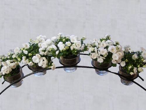 Een ijzeren boog planten rekje met 5 passende potjes. Helaas de plantjes zijn niet inbegrepen. Heeft u wel een idee hoe het er uit ziet.